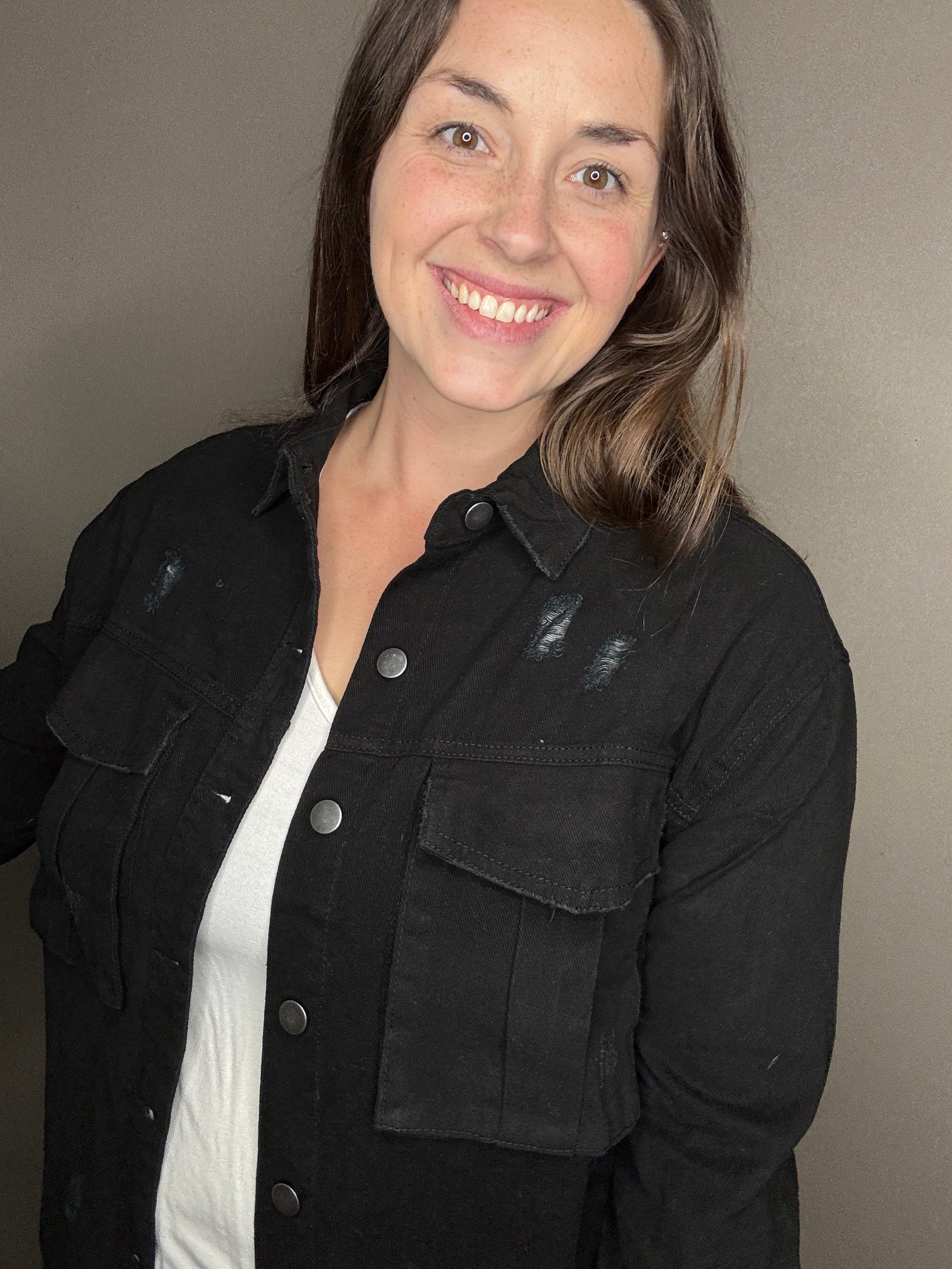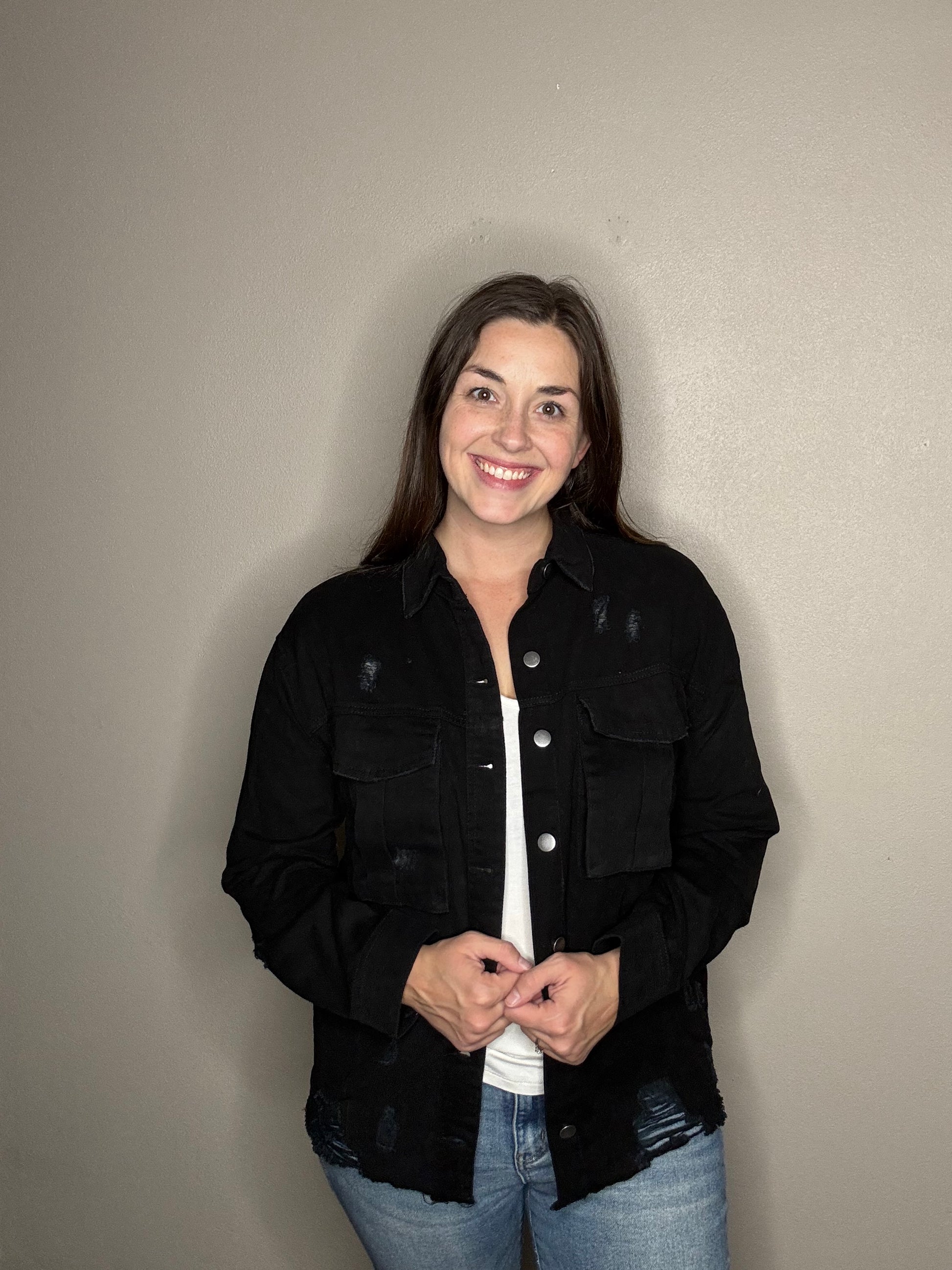Embrace effortless cool with the Distressed Oversized Denim Button Down. Its charming distressed details and relaxed fit offer cozy long sleeves and a classic button-down front, perfect for layering up your playful, laid-back look. This jacket brings a fun twist to your everyday wardrobe!